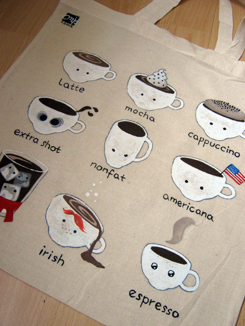Kolejna eko torba bawełniana, wykonana farbami do materiału. Tym razem dla miłośniczki kawy :)